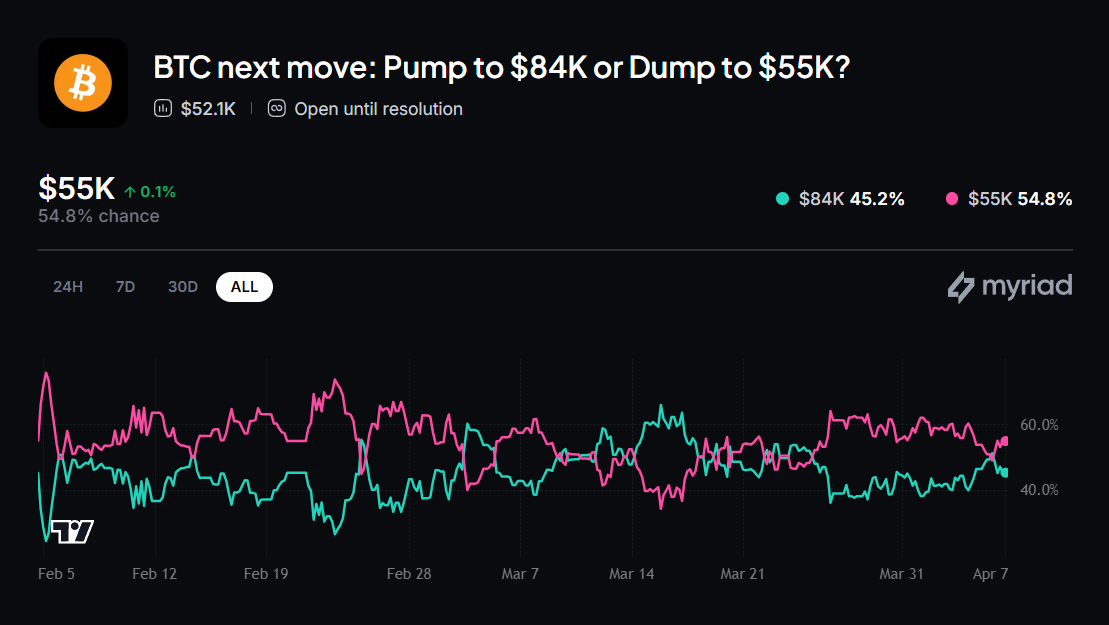 On the crypto side, Myriad users assign a 45% chance that Bitcoin's next major move is a rally to $84,000, while crude oil currently carries an 87% probability of pushing to $120 per barrel. Taken together, these figures capture the mood perfectly: growing optimism, but genuine uncertainty about whether this is the move that sticks.
