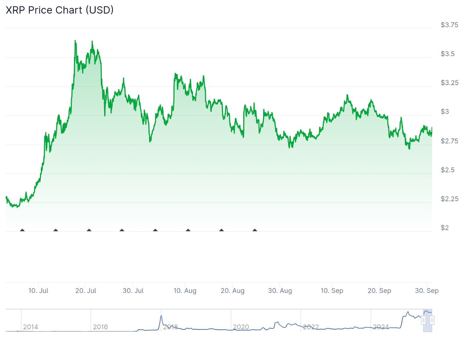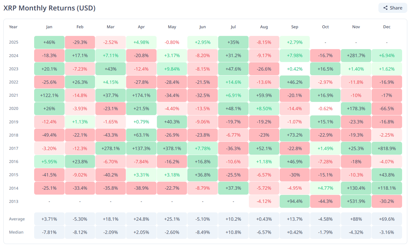 Historically, October has been a rough month for XRP. Over the past decade, it has averaged a –4.5% return, making it one of the weaker months for the token.
