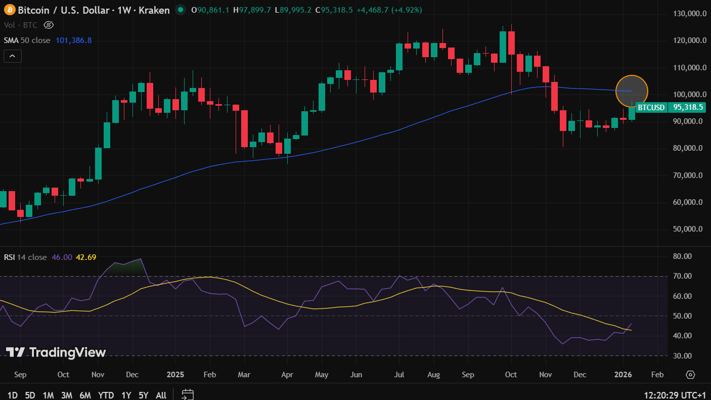 Zooming out, Bitcoin is now approaching its 50-week simple moving average, a level that has historically acted as a dividing line between bearish and bullish phases. A successful reclaim would be notable, as Bitcoin has rarely managed to do this during broader market uncertainty. Failure here could still trigger consolidation, but a clean break would leave the previous all-time high as the last note-worthy psychological barrier.